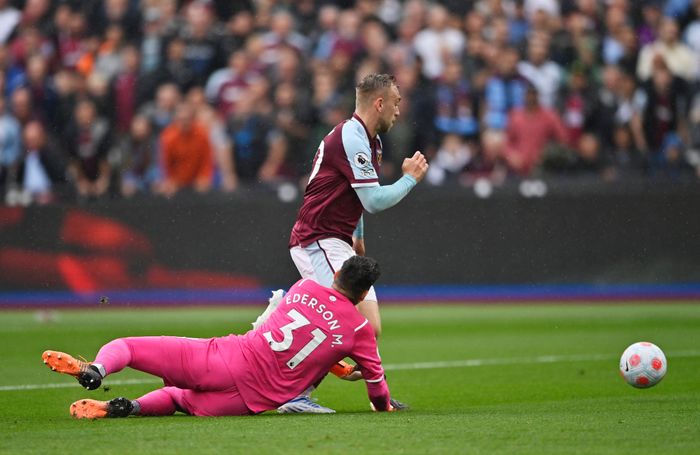 Så scorer Bowen! Fornals slår en helt utsøkt pasning bak City-forsvaret, og dermed kommer Bowen alene med keeper. I den situasjonen er han iskald. Vipper ballen forbi Ederson og setter ballen i mål fra skrått hold! Dermed er Bowens 11. mål denne sesongen et faktum!
