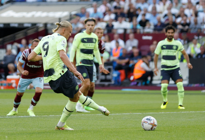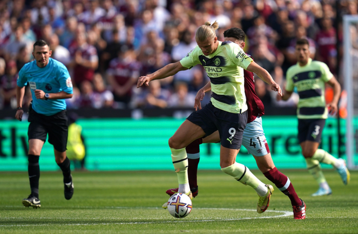 West Ham-keeper Fabianski har nok å gjøre. Først ute å header en lang ball, før han får frispark i duell med Haaland som kaster seg inn i en duell etter innlegg fra De Bruyne.
