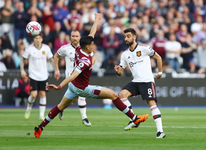 Antony fosser nedover høyresiden og etter han har blitt stoppet av flere West Ham-spillere spretter ballen til Fernandes. Han løsner skudd fra 16, men like utenfor mål.