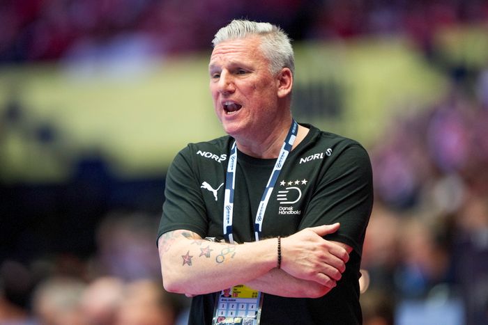 Nikolaj Jacobsen spyr ut beskjeder til spillerne. Bryr seg ikke om at kampen har liten betydning. Engasjert som alltid Danmarks trener.