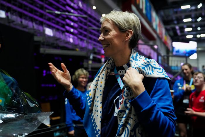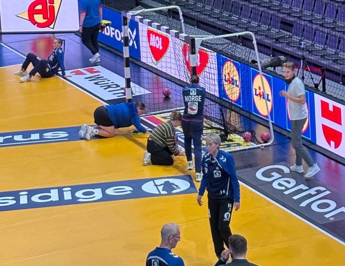 Katrine Lunde har beordret full vask av målfeltet før kampen. Den norske veterankeeperen er nøye på detaljene og reagerer på for mye friksjon i gulvet. Dermed må VM-arrangøren i gang med vaskekluten midt i den norske oppvarmingen.