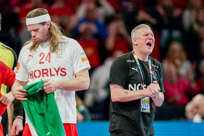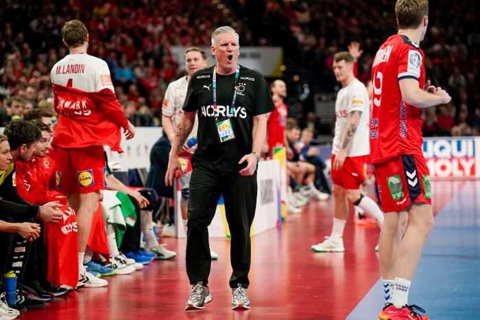 FULL FYRING I DANSKENES LEIR: Danmark-trener Nikolaj Jacobsen kan ikke være annet enn strålende fornøyd på sidelinjen. Han hviler enkelte stjerner og ruller over Norge til pause.