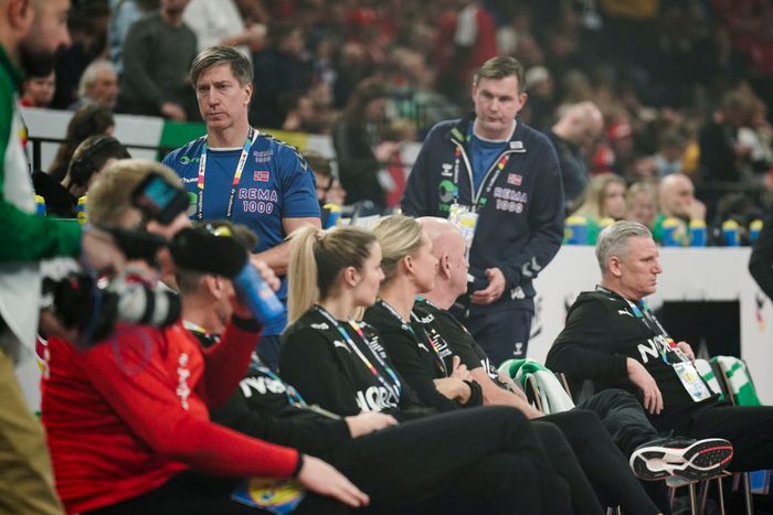 Det blir en tøff test for landslagstrener Jonas Wille (oppe til venstre) i kveld. Han har fått kritiske spørsmål for Norges prestasjoner så langt i mesterskapet. En seier i dag vil være en enorm triumf for treneren.