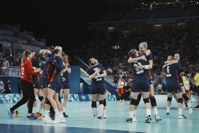 Det gjør ingenting! Norge skal møte Frankrike i OL-finalen! Jentene løper ut på banen og hopper rundt i ring.