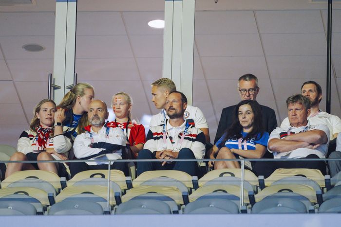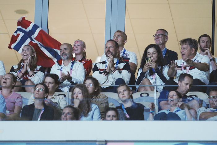Nærmer seg straks semifinale nå! Kronprins Haakon har funnet sitt sete på tribunen i Lille.