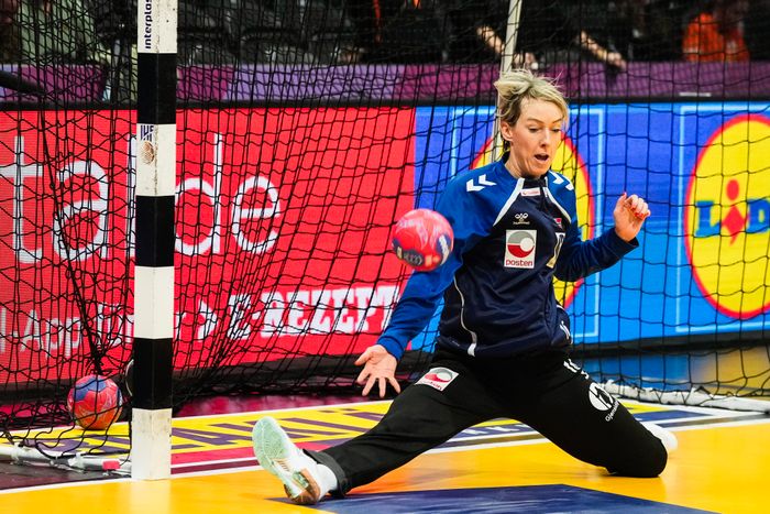 Katrine Lunde i gang med oppvarmingen. 45-åringen starter selvsagt i det norske målet i sin aller siste kamp i mesterskap. VG har nettopp publisert sak på de unike tallene. Lunde har reddet 1749 skudd og har en redningsprosent på 41,4 for Norge i mesterskap siden 2003. Les saken her: https://www.vg.no/sport/i/e71oGO/katrine-lundes-farvel-i-vm-finalen-det-finnes-bare-en-katrine