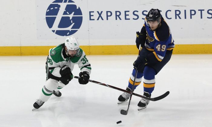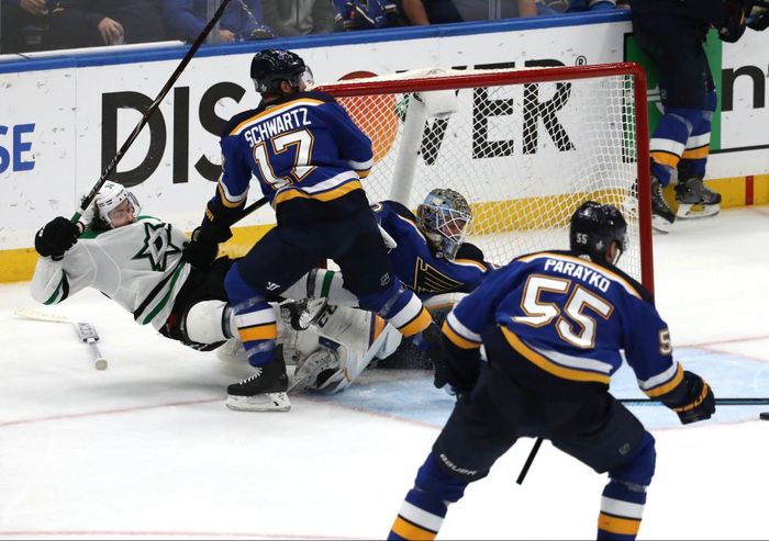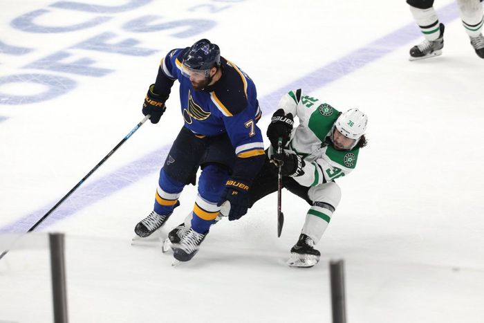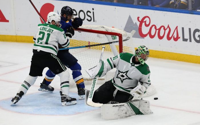 Dallas Stars biter seg fast i sonen til Blues nå, men vertene får til slutt pucken unnå.
