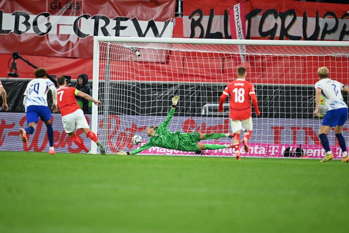 Patrick Pentz i Østerrike-målet får kjenne på ballen. Sikkert godt for målvakten, som ikke har hatt noe å gjøre i denne omgangen.