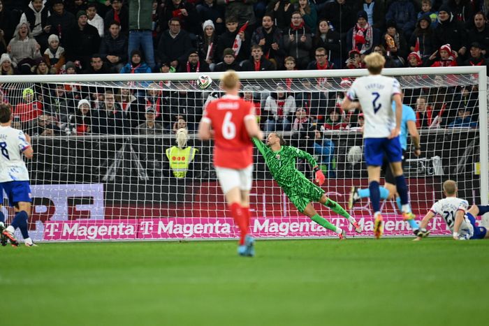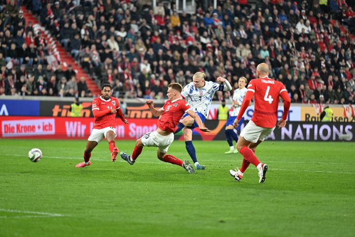 Nære nummer fem. En østerriksk midtstopper stanger ballen like utenfor Nylands stolpe. Så ikke hvem, i forbifarten.