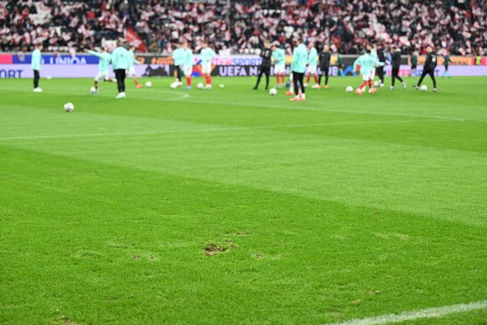 Gressmatten med flere stygge sår. Får håpe det ikke blir en snakkis etter denne kampen. Foto: Bjørn S. Delebekk