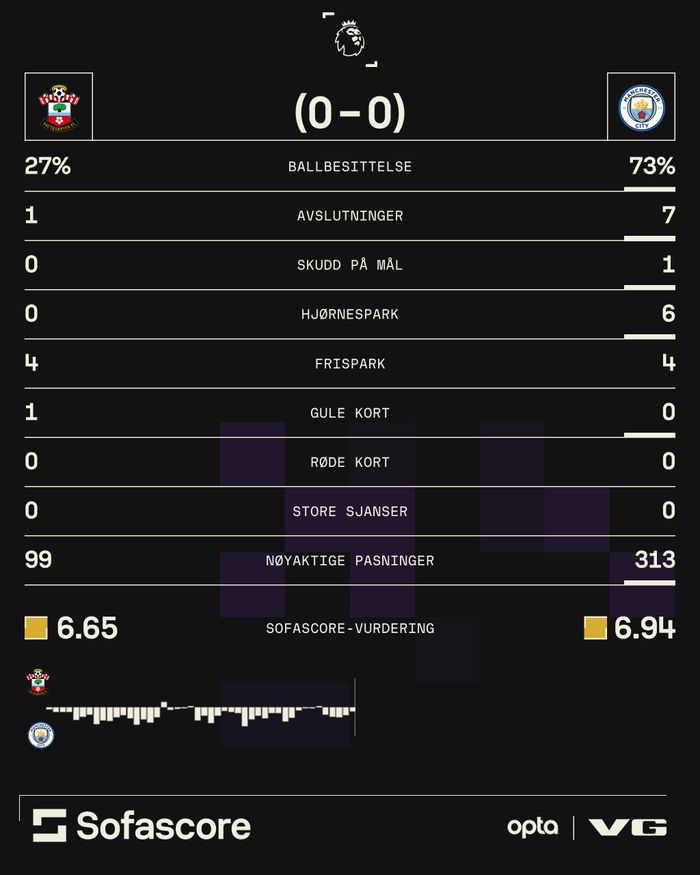 Det ender utrolig nok 0-0 mellom Southampton og Manchester City. – Det er nesten så man ikke tror det, sier Viaplays kommentator Nils Johan Semb. City totaldominerte hele kampen, men fikk aldri ballen i mål bak Aaron Ramsdale. Dermed kan Southampton juble for sitt 12. poeng denne sesongen, mens de lyseblå fra Manchester gikk glipp av to viktige poeng i kampen om Champions League-plass neste sesong. Erling Braut Haaland fikk ikke det comebacket han drømte om, og måtte gå målløs av banen - som resten av City-laget.