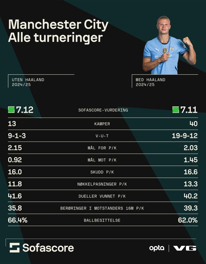 Slik har City klart seg med og uten Haaland denne sesongen, i alle turneringer: