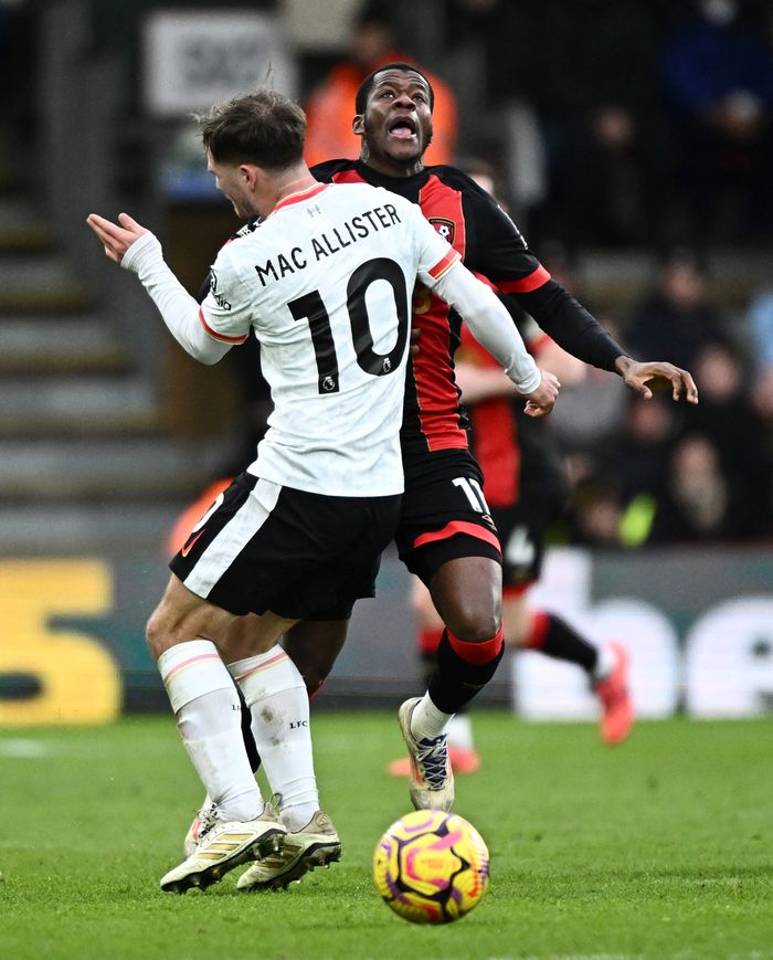Mac Allister prøver seg også på en brasse, men får en Bournemouth-spiller i ryggen idet han skal avslutte.
