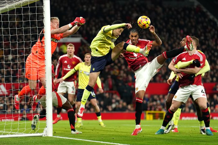 Amad får en kjempemulighet og dundrer til. Men skuddet blir blokkert av Harwood-Bellis. Der så jeg ballen i mål. En kjempejobb av Southampton-forsvareren.