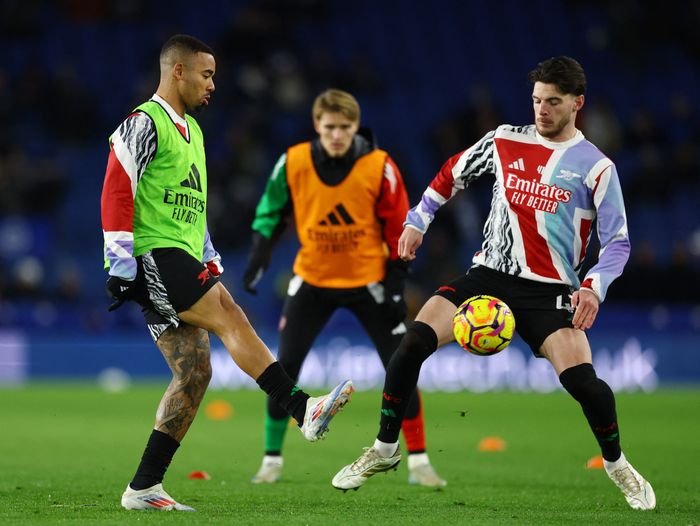 Jesus og Rice i oppvarming. Ødegaard i innbyttervest her.