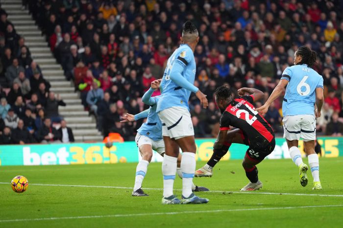 BOURNEMOUTH TAR LEDELSEN! De har startet bra og nå får de uttelling. Kerkez drar seg forbi Foden ute til venstre før han slår inn foran mål. Semenyo spinner rundt med Gvardiol i ryggen og banker inn 1-0! Foto: Kirsty Wigglesworth / AP