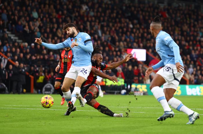 City spiller seg fint fri på venstresiden. Nunes drar seg til dødlinjen før han slår inn langs bakken. Den går forbi Haaland men treffer Bernardo Silva. Kun en heroisk blokkering fra Milos Kerkez sørger for at Bournemouth fortsatt leder!