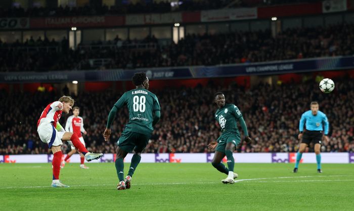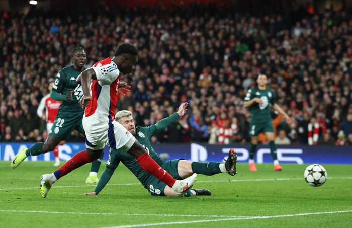 Hva er det som skjer i Monaco-forsvaret!? Salisu skal spille tilbake til Majecki. Pasningen blir polakken tvunget til å klarere rett i beina på Saka, som setter ballen sikkert i mål fra fire meter. Det var fort spikeren i kisten!