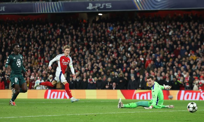 Arsenal tar tak i ballen. Martin Ødegaard som vanlig god i trange situasjoner.