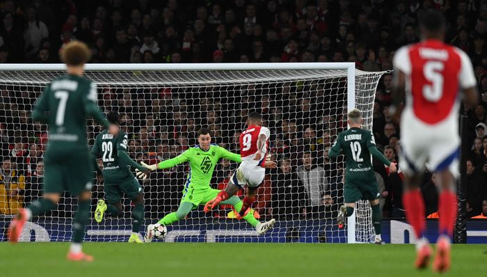 Arsenal fortsetter å presse på. Trossard kommer til slutt til en avslutning, men til side for mål.
