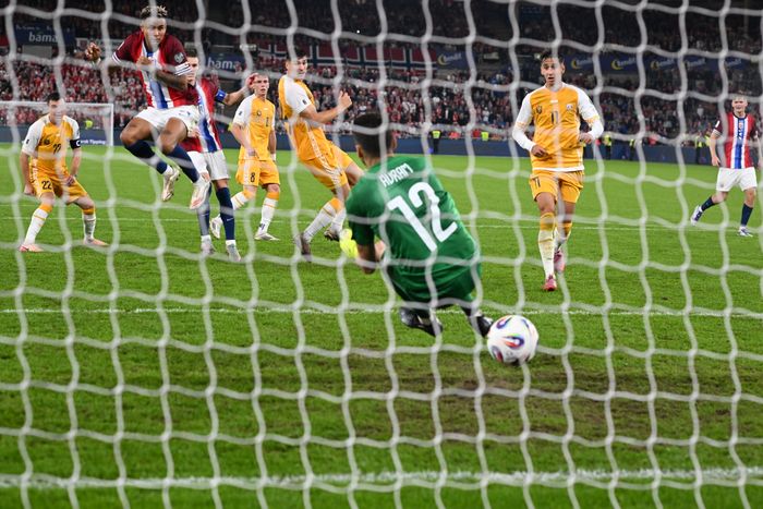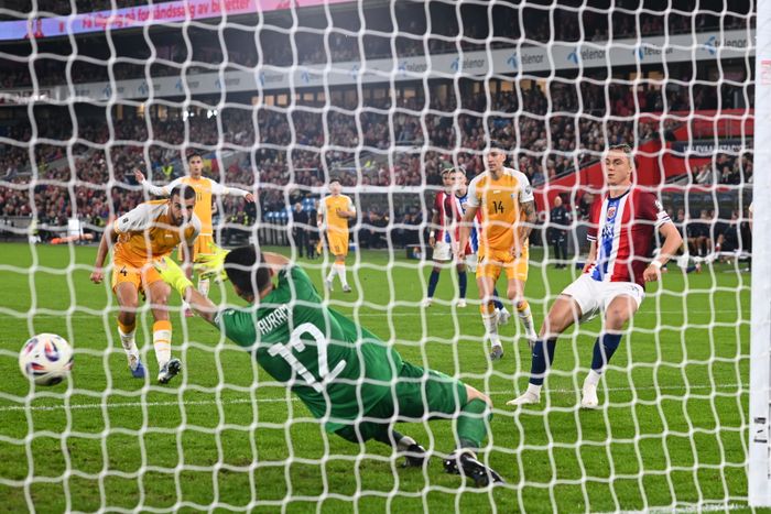 Og der var den andre innbytteren Oscar Bobb også nære på å sette Norges åttende for kvelden. Avslutningen går midt på mål.