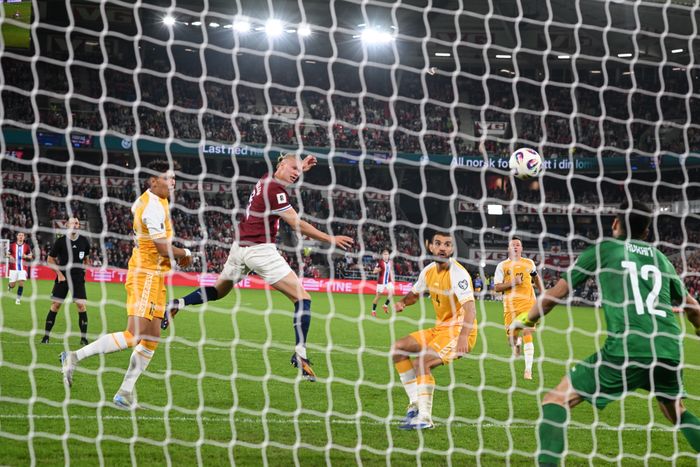 Fra Haaland. Har så enorm spenst, og han får et godt treff med hodet.