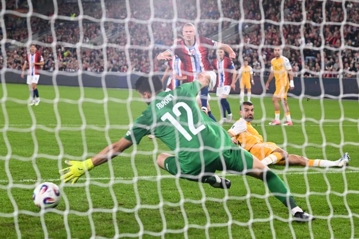NUMMER FEM! Odd Wang Sørensen var den eneste som har scoret fem mål i en kamp for Norge - det gjorde han i 1948. Erling Braut Haaland gjør det samme 77 år senere. Vet ikke hva mer jeg skal skrive. Foto: Bjørn S. Delebekk / VG.