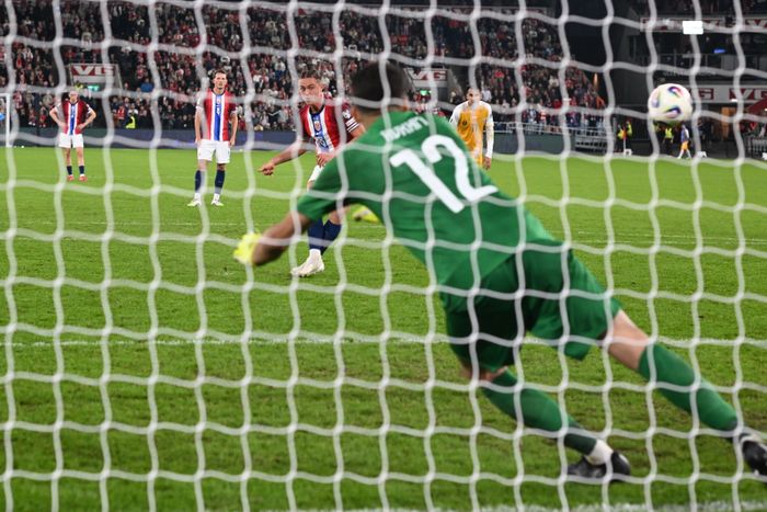 HAN ER SÅ SIKKER! Thelo Aasgaard med hattrick?!?! Den så i hvert fall ikke jeg komme:) Setter den knallhardt oppe i venstre hjørne, keeper går motsatt. Foto: Bjørn S. Delebekk / VG.