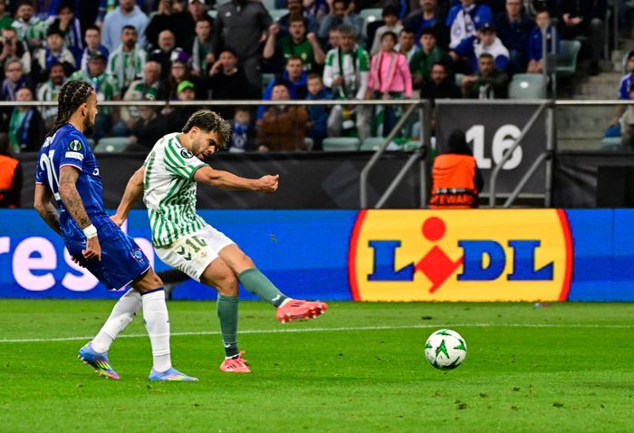 Ezzalzouli holder lekestue med Gusto og passerer Chelsea-backen veldig enkelt. Gusto får kastet inn et bein i det Ezzalzouli slår inn og hjørnespark til Betis.