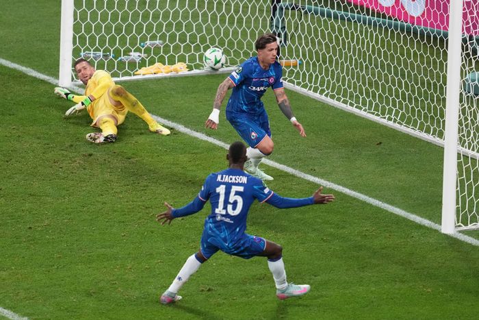 Så har Chelsea snudd kampen! Palmer holder og holder på ballen på høyrekanten får han vender seg fri og slår inn med høyrefoten. Foran mål er Jackson, som får ballen i brystet og får den i målet bak Adrian.
