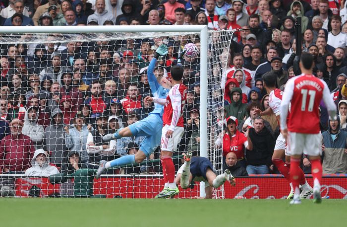 Fint innlegg fra Arsenals Madueke. Men for høy for Merino.