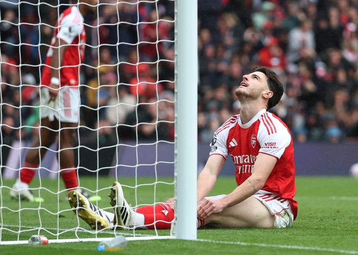 Rice bryter på midten og spiller til Trossard, som har enorme rom til venstre.