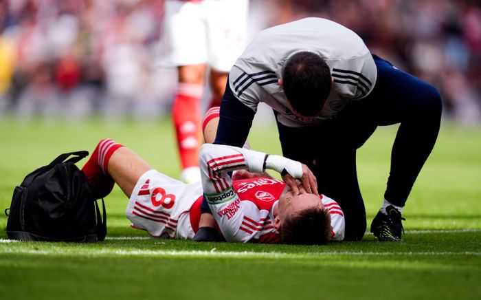 Martin Ødegaard ligger nede. Ser ut til å ha det vondt. Kan det være skulderen igjen?