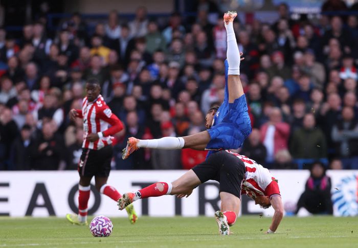 Cucurella blir litt liten i luftduell med Ballard og Hume. Cucurella mener han blir revet i drakta av Hume i duellen.