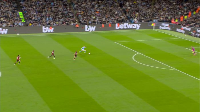 Semenyo utfordrer Nunes og kommer seg forbi ned til hjørneflagget. Der pakkes han inn av en portugiser til ettersom Bernardo Silva også følger helt ned. Ender med innkast til City.