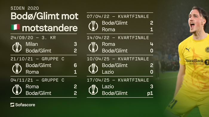 Minner om siste tre ganger italiensk motstand har vært i Bodø. 6-1 mot Roma (2021), 2-1 mot Roma (2022) og 2-0 mot Lazio (2025). 10-2 sammenlagt. Øker dette i kveld?