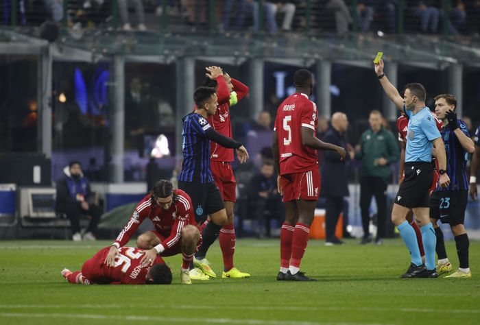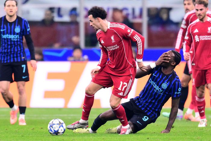 Tar salto Andy Robertsen når Lautaro Martinez kommer altfor altfor sein inn i Liverpool-backen. Kommer ikke med knottene første der argentineren, men hadde han gjort det hadde kortet hatt en annen farge.