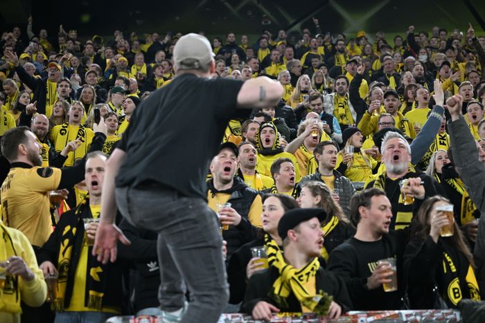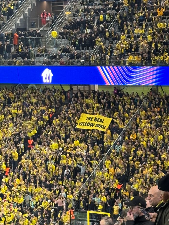 Signal Iduna Park er kjent for den gule veggen - men de tilreisende Glimt-supporterne tar opp kampen! Foto: Jens Friberg / VG.