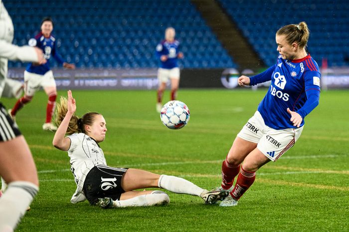 Vickius brøyter seg gjennom RBK-presset før hun blir holdt igjen. Frispark VIF midt på banen.