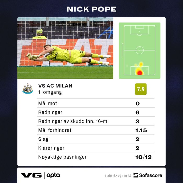 Men den corneren får de ikke ta. Dommeren blåser av oppgjøret. Det ender 0-0. Milan skapte mange store sjanser, men det var en levende vegg mellom stengene i Newcastle-målet.