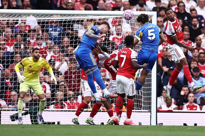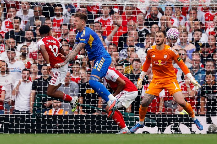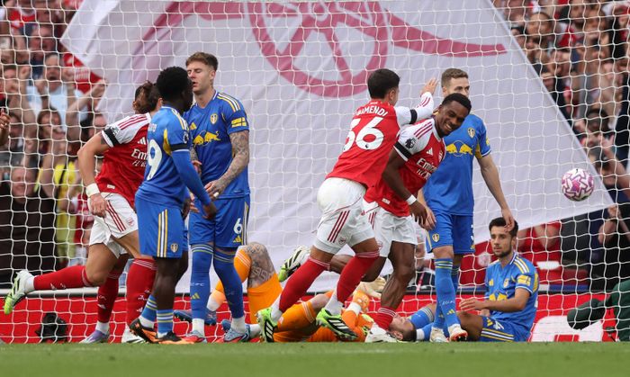 Leeds vinner ballen høyt etter en feilpasning fra Gabriel, men Arsenal tar den tilbake umiddelbart.