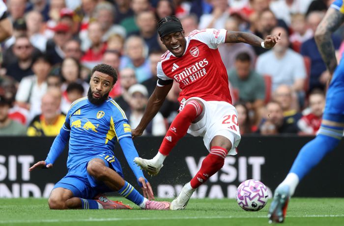 Arsenal vinner ballen høyt, og den ender hos Nwaneri utenfor boksen. Han smeller til med en gang, via et Leeds-bein og ut til hjørnespark.