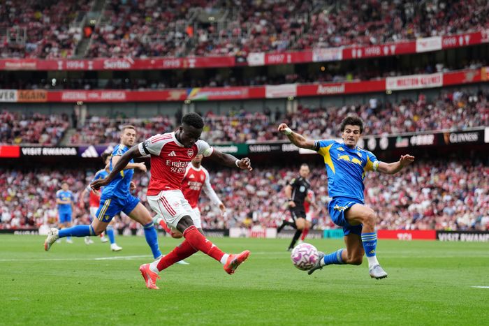 Trossard med en nydelig crosser til Dowman. 15-åringen får hele Emirates til å reise seg i det han skjærer innover, men skuddet blåses ganske langt over Leeds-målet.