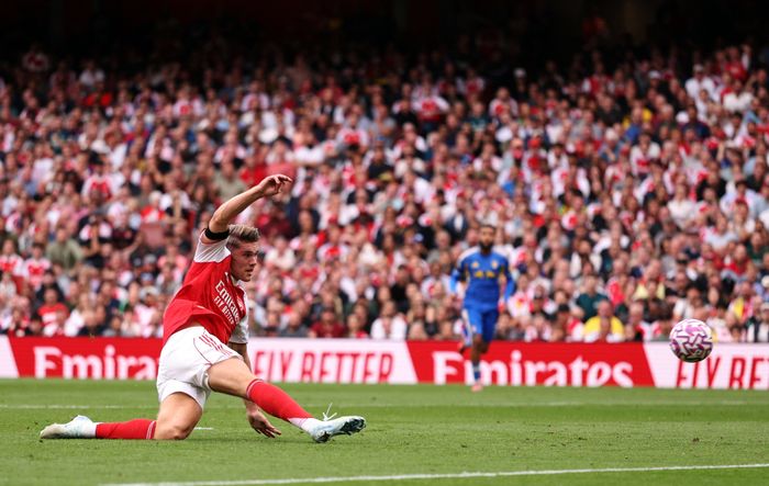 Gabriel slår en strålende høy ball til Saka på høyrekanten. Saka finner Ødegaard på 18 meter og nordmannen klemmer til. Går på utsiden av Perris venstre stolpe.