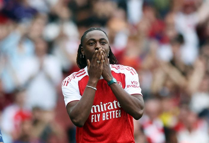 Eze kommer smilende ut på sin nye hjemmebane med Arsenal-drakten på.