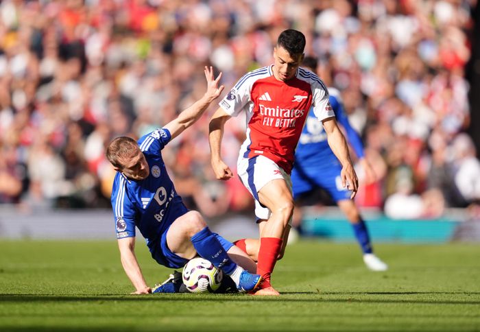 Saka går i bakken like utenfor sekstenmeteren til Leicester, men får ingenting. Ingen tvil om at han får en dytt av Okoli der. Det dømmes utspark.