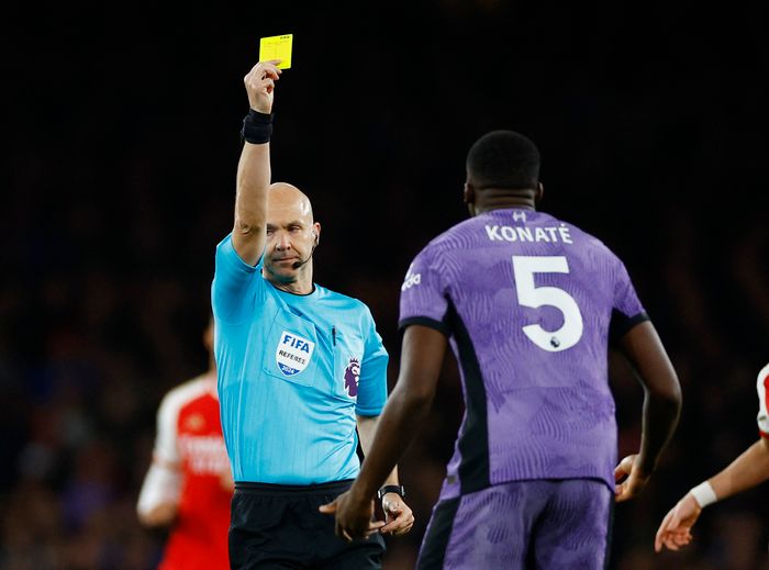 To gule kort - og Liverpools vei tilbake nå blir tøffere. Havertz er i ferd med å rive seg fri fra Konate, men stoppes.