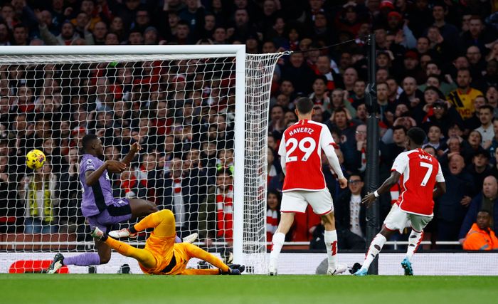 Nydelig angrep der Ødegaard spiller gjennom Havertz. Skuddet blir reddet - men Saka setter inn returen. Alisson er sjanseløs der.