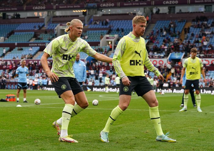 Erling Braut Haaland og Kevin de Bruyne under oppvarming på Villa Park lørdag kveld. Foto: PA PHOTOS.