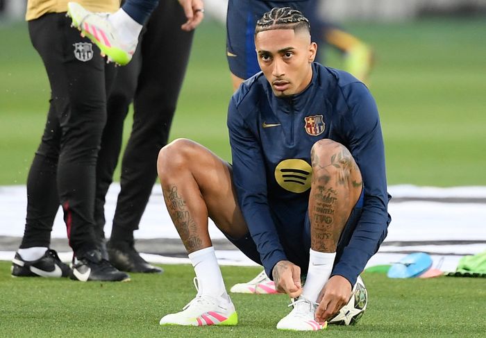 Raphinha slår mot Garcia på bakre. Blir et hode-til-hode-støt med Bastoni, som blir liggende.